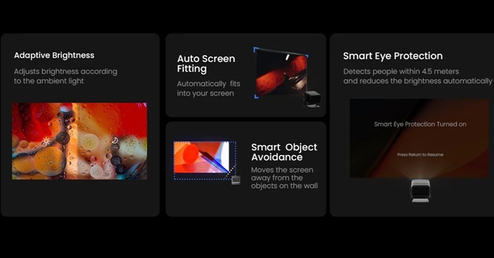 Với tính năng tự động cân bằng độ sáng, Auto cân chỉnh hình ảnh, Auto tránh vật cản, chiếu lệch góc và bảo vệ mắt khi ai đó vô tình nhìn vào ống kính máy chiếu.